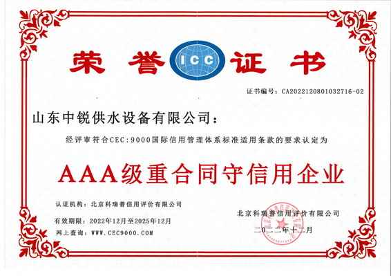 AAA級(jí)重合同守信用企業(yè)榮譽(yù)證書(shū)